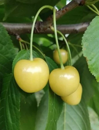 Les cerises sont de taille moyenne et de couleur blanche, parfois légèrement translucide.
